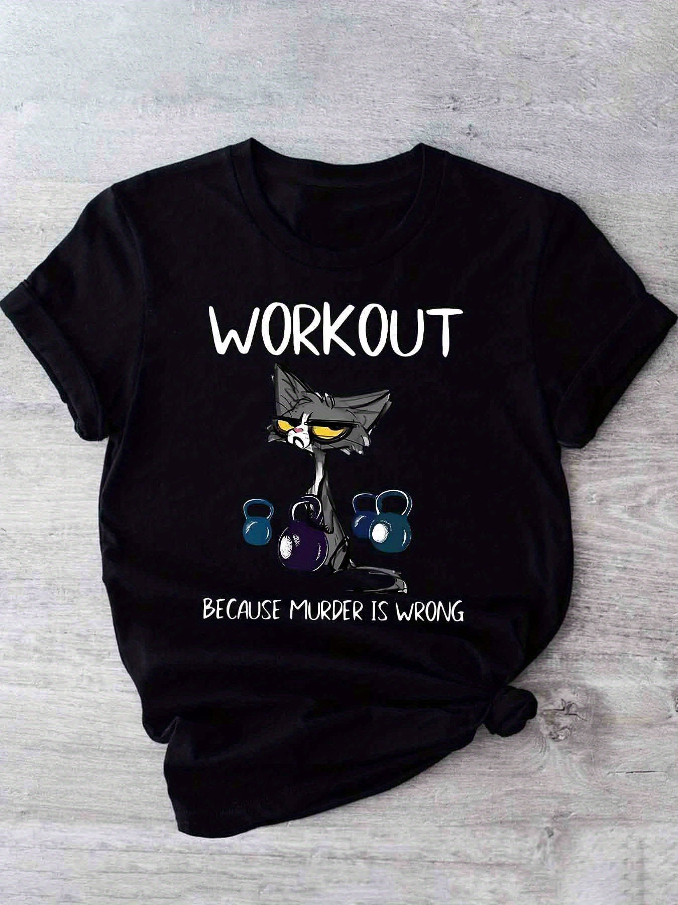 [Humorous Workout T-Shirt] 1pc Women's Casual Short Sleeve T-Shirt | Soft, Lightweight, Humorous Cat & Dumbbell Graphic Print, "Workout Because Murder Is Wrong" Slogan, Machine Washable, All-Season Comfort for Gym & Casual Attire