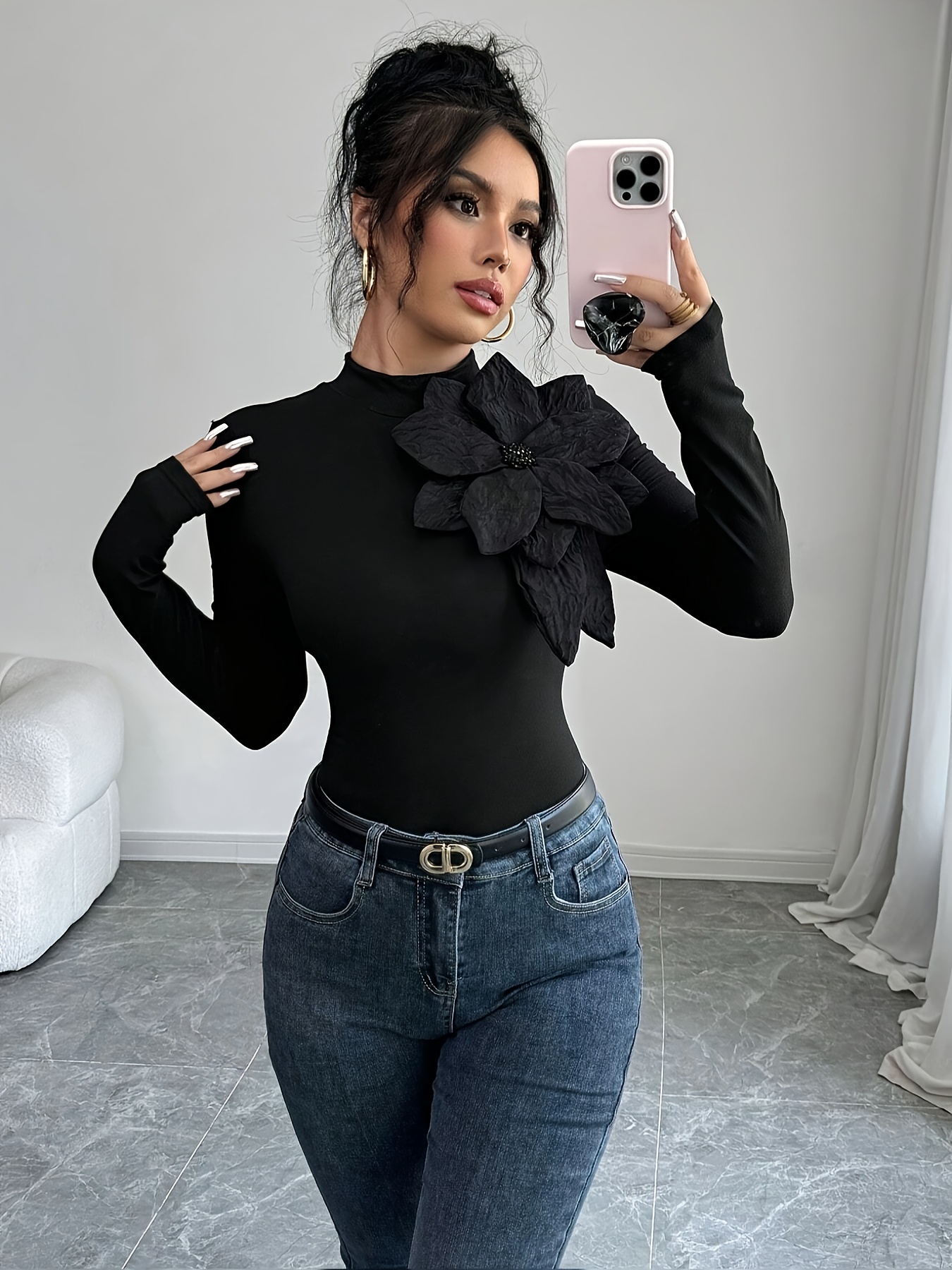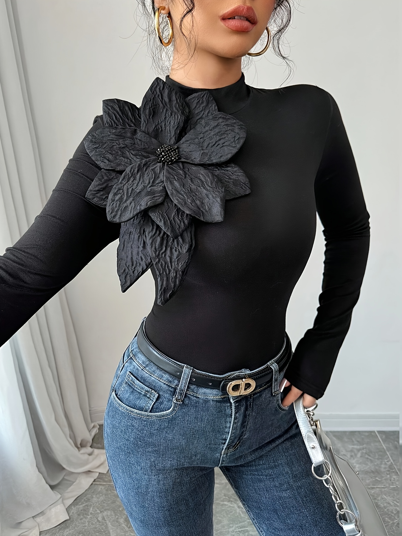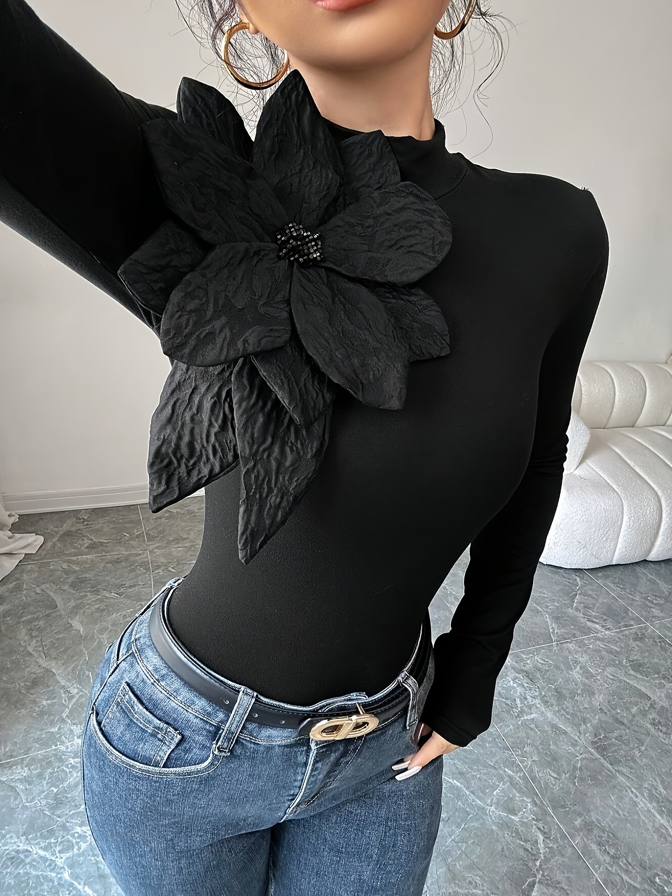 [Floral Embellished Crop Top] Elegant Floral Embellished Women's Black Long-Sleeve Crop Top | High Neck, Ruched Design, Cinched Waist, Perfect for Casual or Stylish Outfits
