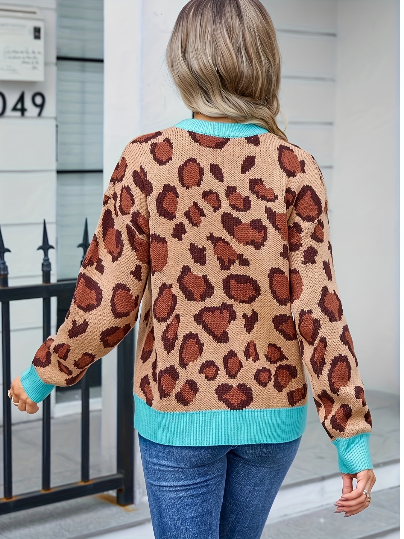 Plus Size - Women'S Plus Size Leopard Print Sweater with Turquoise Cuffs - Cozy Pullover, Loose Fit, Round Neck, Casual Style for Spring/Fall, Casual Wear|Leopard Print Top|Stretchy Fabric