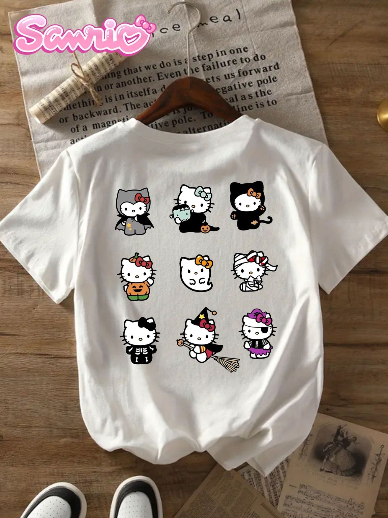 Sanrio Hello Kitty Women's Halloween Graphic T-Shirt - Front & Back Print with 12 Spooky Cute Designs, Applique Details, Casual Round Neck Tee, Machine Washable, Fashion Brand Collaboration Top