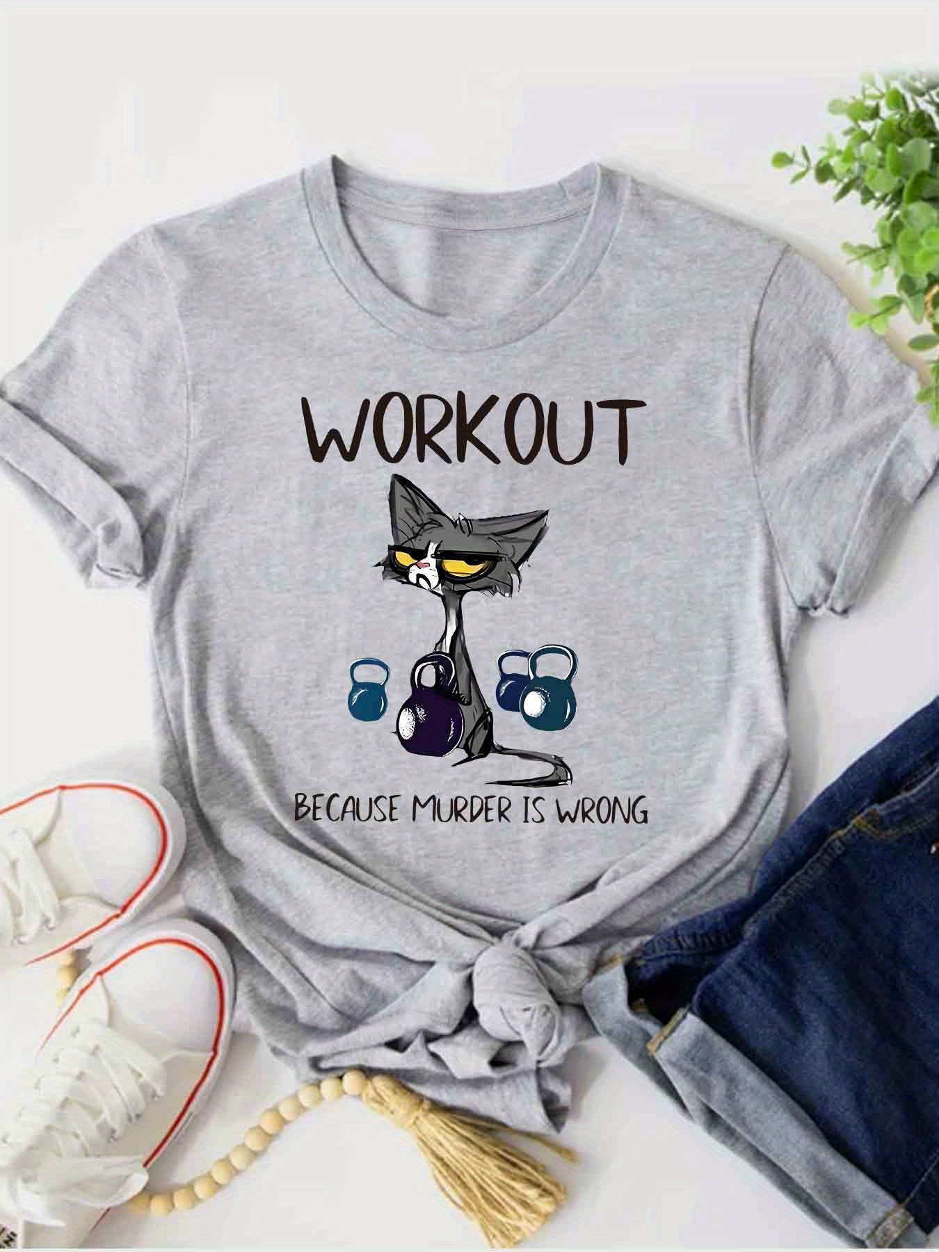 [Humorous Workout T-Shirt] 1pc Women's Casual Short Sleeve T-Shirt | Soft, Lightweight, Humorous Cat & Dumbbell Graphic Print, "Workout Because Murder Is Wrong" Slogan, Machine Washable, All-Season Comfort for Gym & Casual Attire