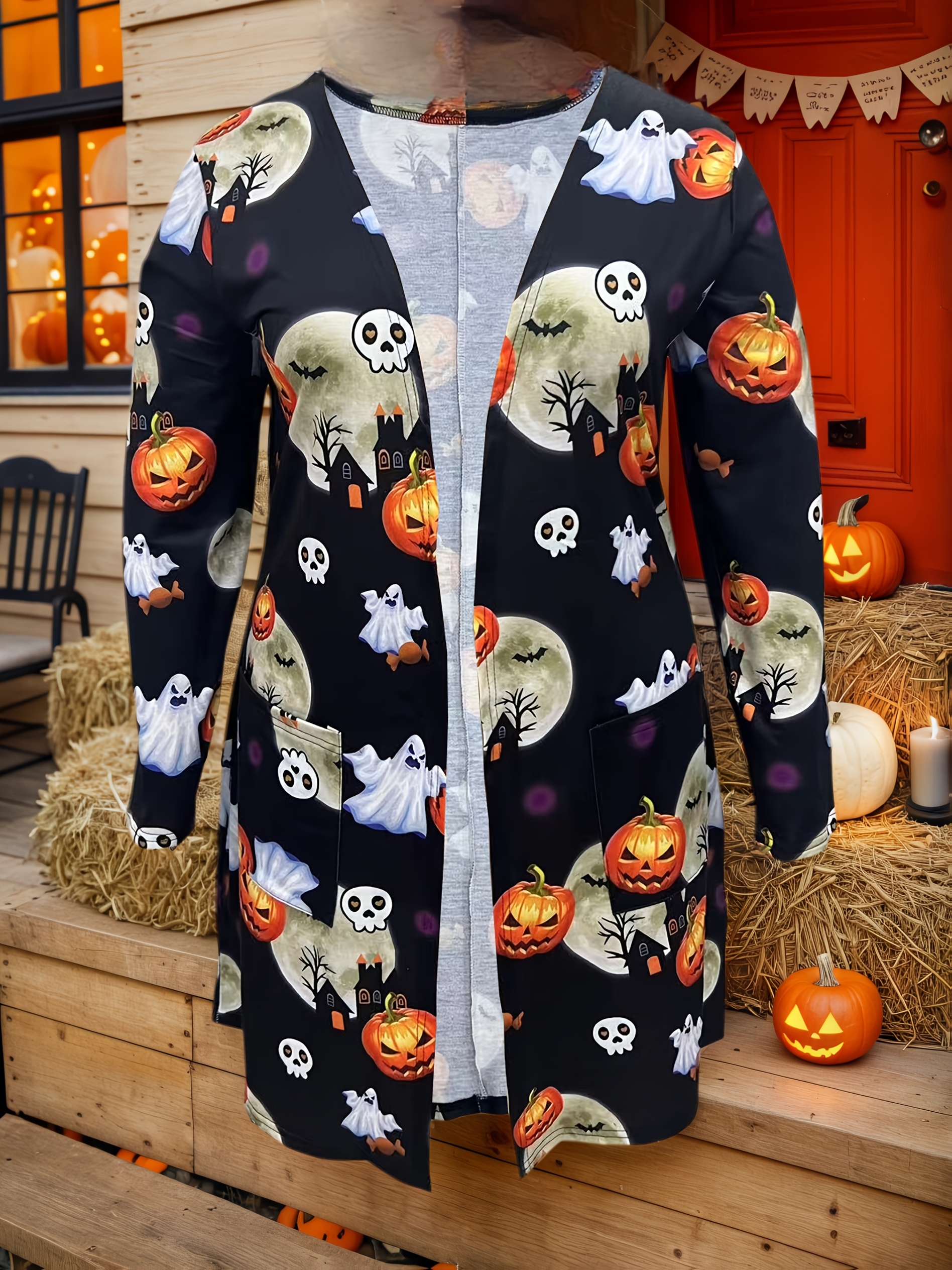 Plus Size - Plus Size Women'S Halloween Pumpkin Print Cardigan - Casual Long Sleeve with Ghosts, Bats & Autumn Leaves Design, Black & Orange, Perfect for Fall & Winter, Halloween Costume