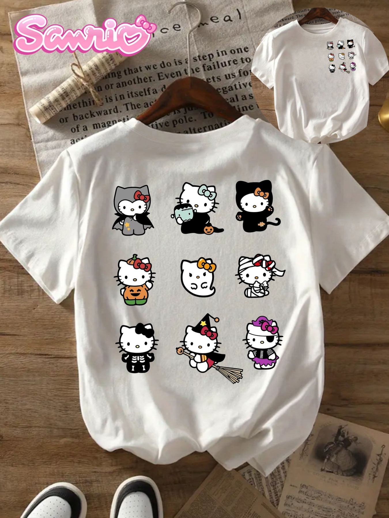 Sanrio Hello Kitty Women's Halloween Graphic T-Shirt - Front & Back Print with 12 Spooky Cute Designs, Applique Details, Casual Round Neck Tee, Machine Washable, Fashion Brand Collaboration Top