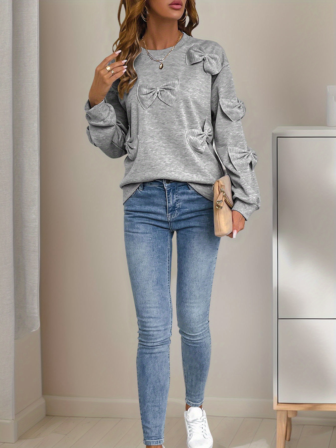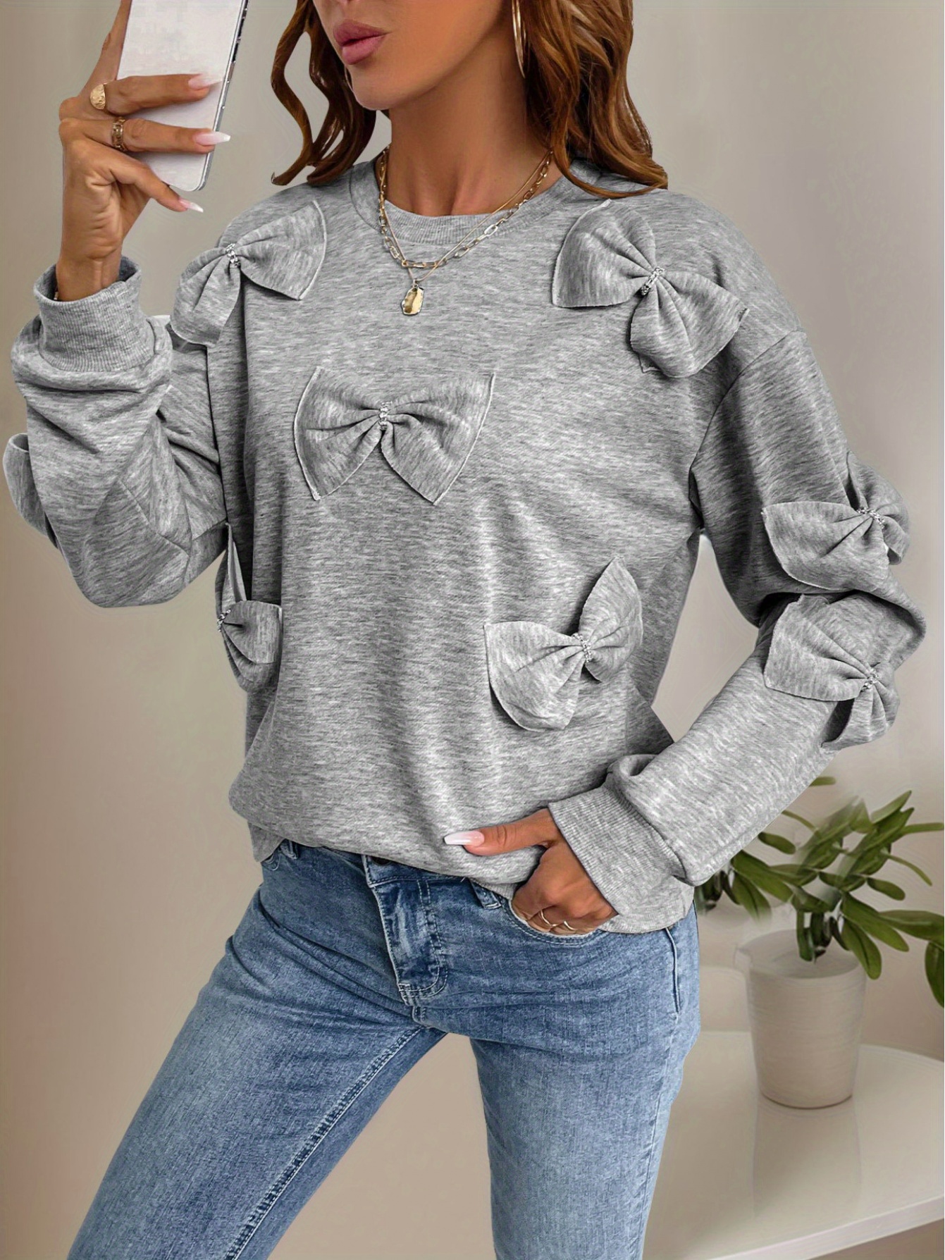 Women'S Casual Pullover Long Sleeve Sweatshirt with Decorative Bows - Soft Gray Loose Fit Crew Neck Top for Spring & Fall, Perfect for Casual Attire, Relaxed Fit Top | Bow Embellished Top | Comfortable Fit